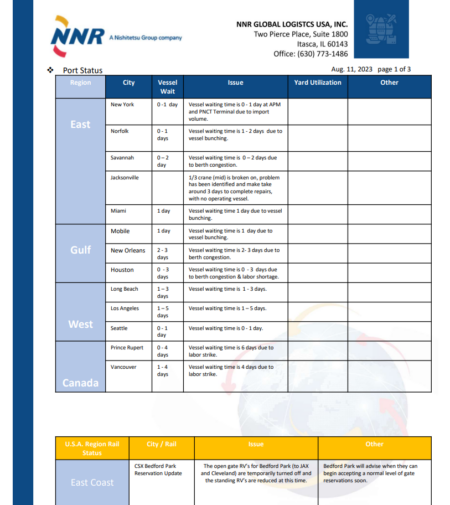 In July, spot rates between Asia and the U.S. have been increasing by double digits, reaching levels similar to early 2023 and late 2022. This is a direct result of carriers’ discipline in managing vessel capacity by voiding several sailings, removing around 35% of capacity from the market. Other factors contributing to spot rates stem are labor disruption in British Columbia and a more positive outlook for cargo demand in North America. This trend is expected to continue through September.